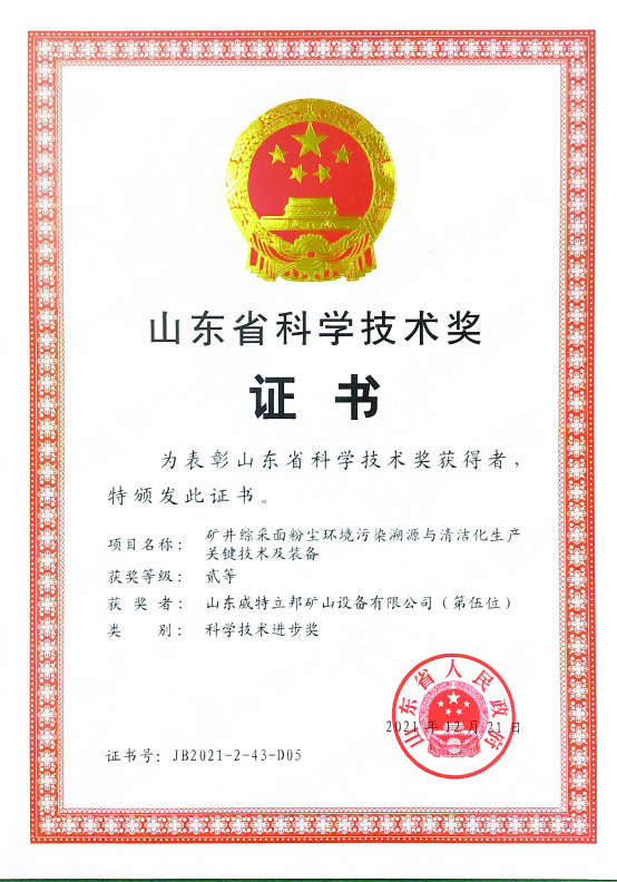 • 濟寧市首屆創新大賽“煤礦采掘面濕噴除塵系統設備”創新組二等獎